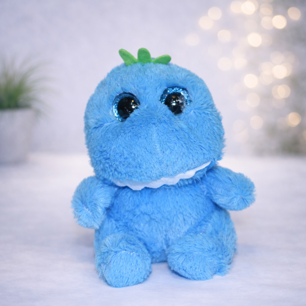 Блакитний велоокий динозавр 8 дюймів — м’яка плюшева іграшка з великими блискучими очима та милим дизайном. Приємний на дотик матеріал робить її ідеальною для обіймів та дитячих ігор.