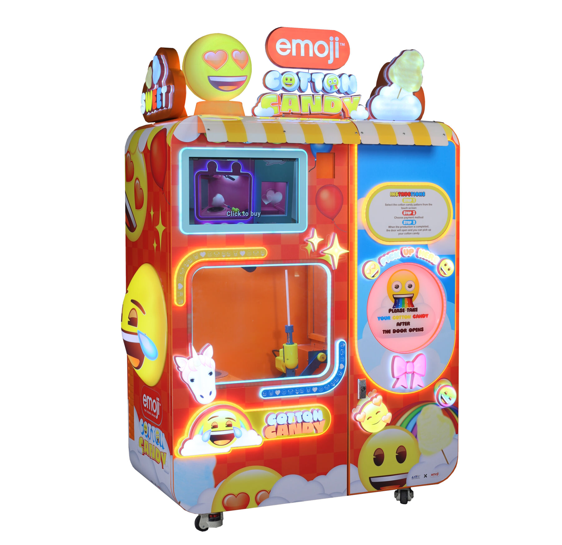 emoji™ Cotton Candy поєднує автоматизований сервіс, розвагу та привабливий дизайн, що допомагає залучати відвідувачів і збільшувати продажі.