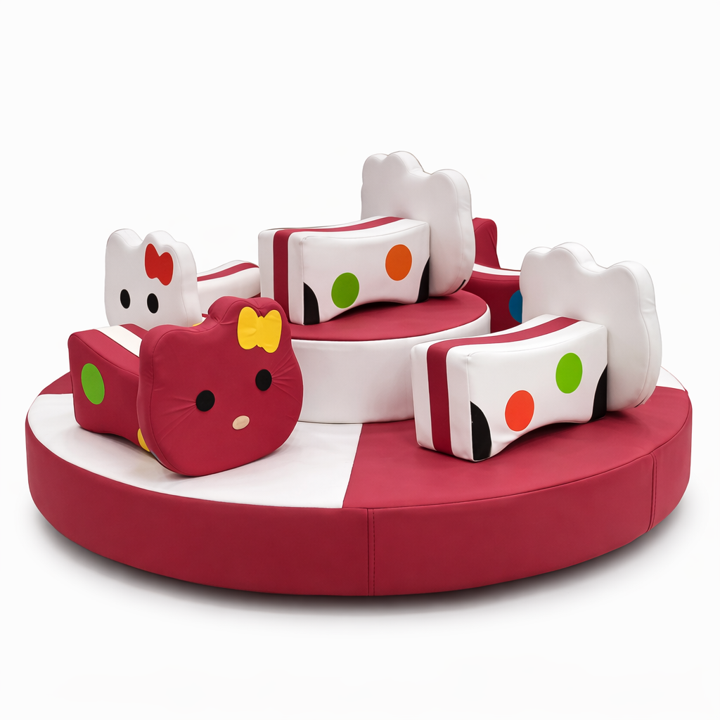 Карусель має круглу м’яку платформу з комфортними сидіннями у формі Hello Kitty. Завдяки продуманій конструкції діти можуть безпечно сидіти та насолоджуватися плавним обертанням атракціону.