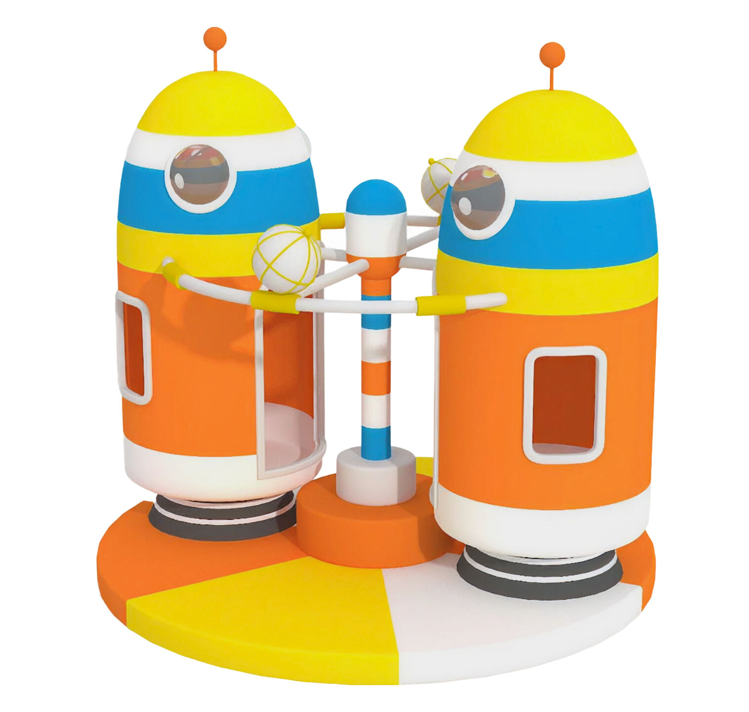 Дитяча карусель у вигляді космічних капсул для indoor playground. Яскравий дизайн, безпечні кабіни та плавне обертання створюють захопливу космічну пригоду для дітей.