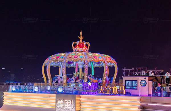 Карусель Luxury Royal Crown на 52 місця вирізняється серед класичних моделей завдяки унікальному дизайну у формі корони. Основним кольоровим акцентом є золота гама, доповнена розкішним декоративним підсвічуванням, що створює справжню казкову та мрійливу атмосферу.