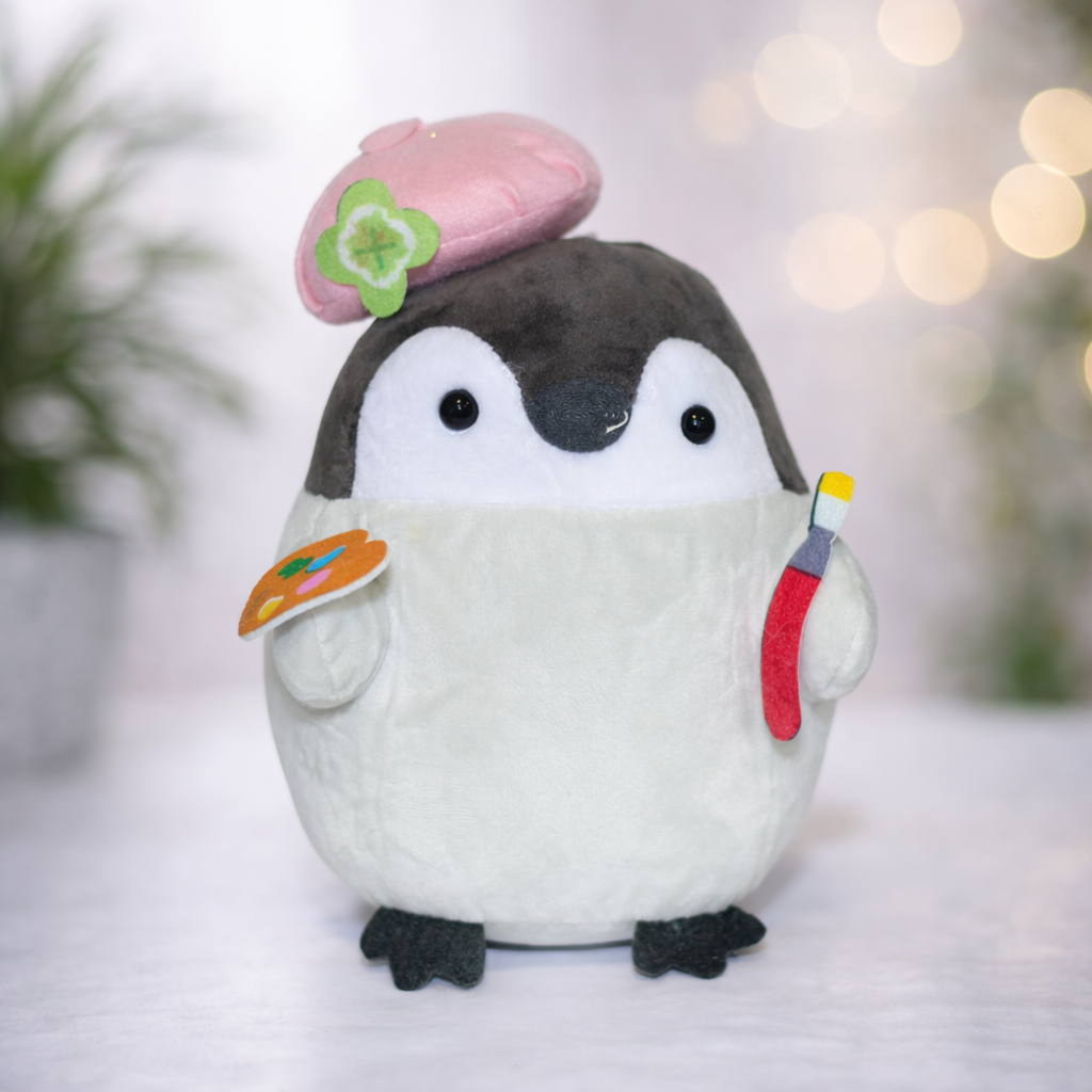 Милий малюк пінгвіна — це м’яка плюшева іграшка з творчим та незвичайним дизайном. Пінгвін зображений у образі маленького художника з беретом, палітрою та пензликом, що додає іграшці особливого шарму.