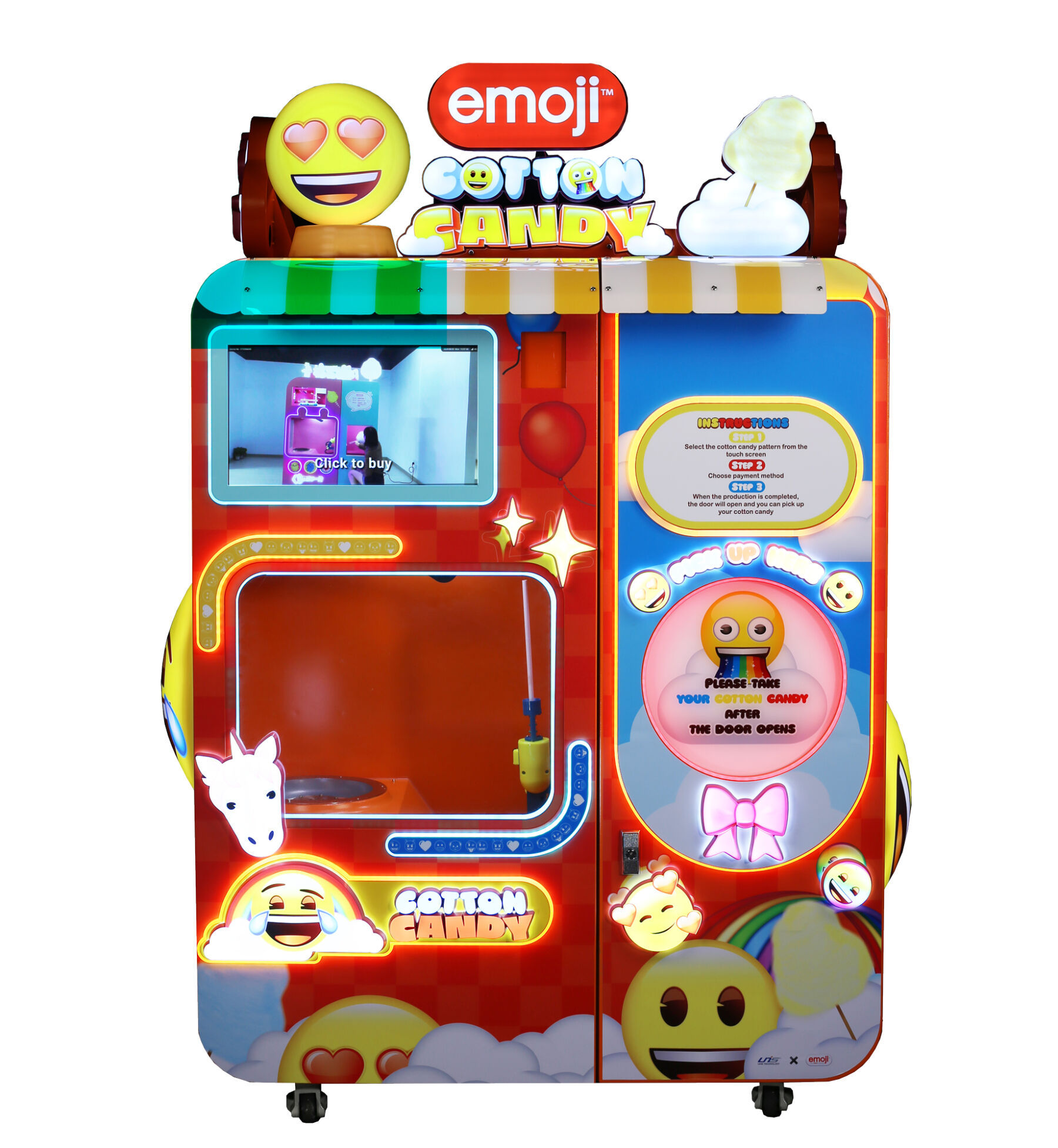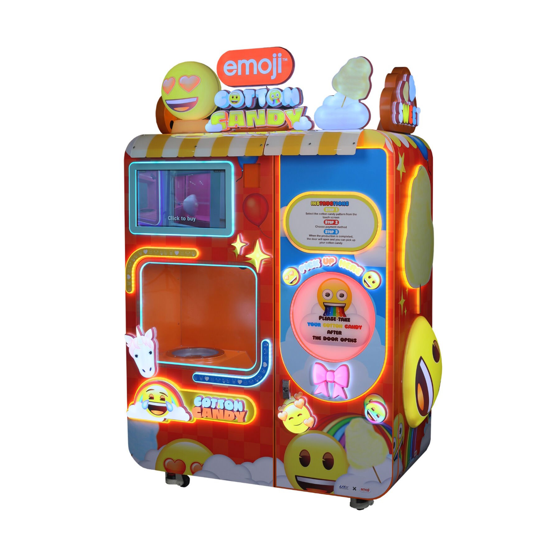 emoji™ Cotton Candy поєднує автоматизований сервіс, розвагу та привабливий дизайн, що допомагає залучати відвідувачів і збільшувати продажі.