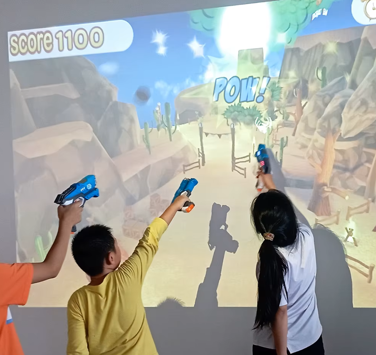 Інтерактивна стрільба – це захопливе заняття, що розвиває швидкість реакції та виховує почуття спортивного суперництва. Космічні цілі, роботи, повітряні кульки, та інші мішені з'являються на проекції, а учасники повинні стріляти по них із бластерів. на стіні, а діти повинні стріляти по них із лазерних бластерів. Це сприяє активному проведенню часу, а також розвиває моторику.