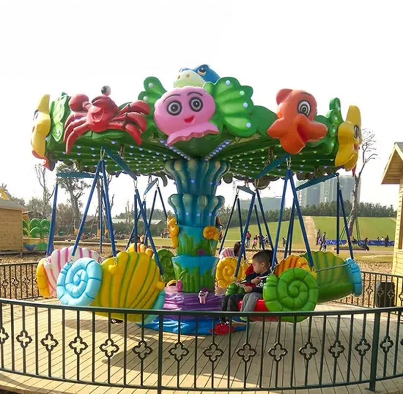 Ocean Mini Flying Chair — це популярний дитячий атракціон типу літаючих крісел, виконаний у яскравій морській тематиці. Атракціон також відомий як flying chair або swing ride та ідеально підходить для парків розваг, тематичних центрів і сімейних зон відпочинку.