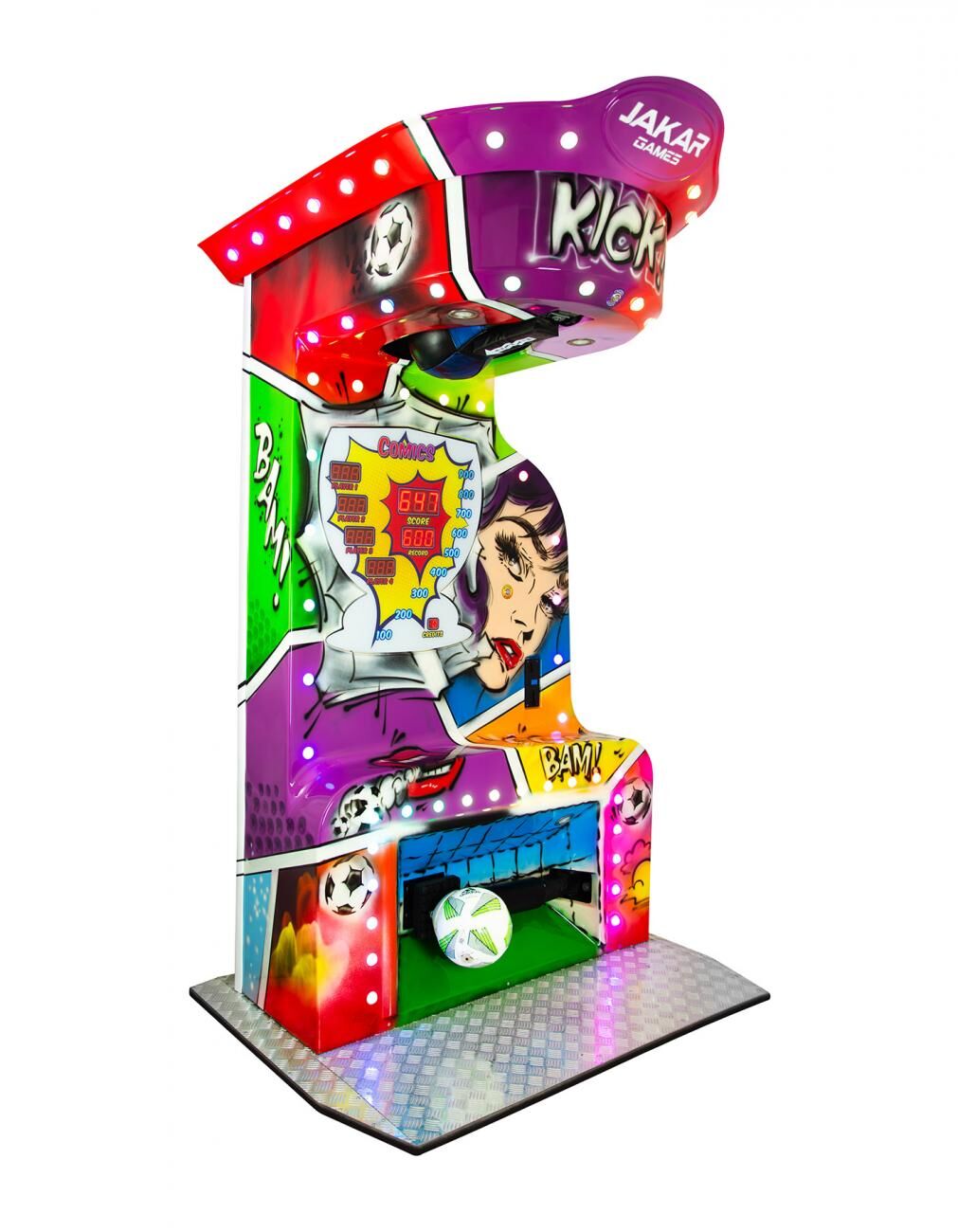 Кікбоксер - 2 в 1 – це динамічний автомат, який пропонує не не одне, а два захопливих випробування, займаючи при цьому місце, зазвичай відведене для однієї гри. Швидким натисканням верхньої кнопки випустіть на свободу свій внутрішній боєць, коли на вас впаде боксерська груша, перевіряючи вашу силу і влучність. А натиснувши на нижню кнопку, ви зможете взяти участь у адреналіновий футбольний матч проти механізованої руки, продемонструвавши свою силу. Підсвічена зачаровуючим світлом яскравих RGB-світлодіодів, ця гра привертає увагу здалеку, створюючи незабутнє видовище для гравців.