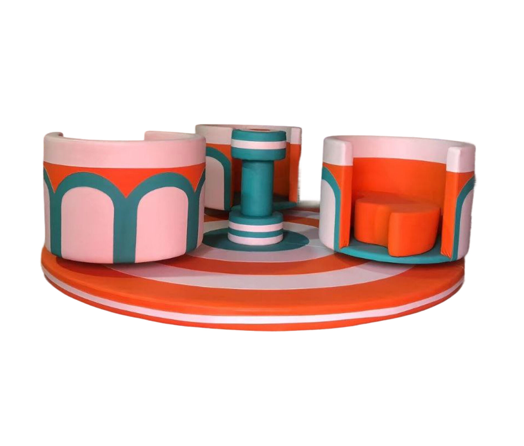 М’яка карусель для дитячих ігрових кімнат з безпечними сидіннями та плавним обертанням. Ідеально підходить для дитячих садків, розважальних центрів і indoor playground.