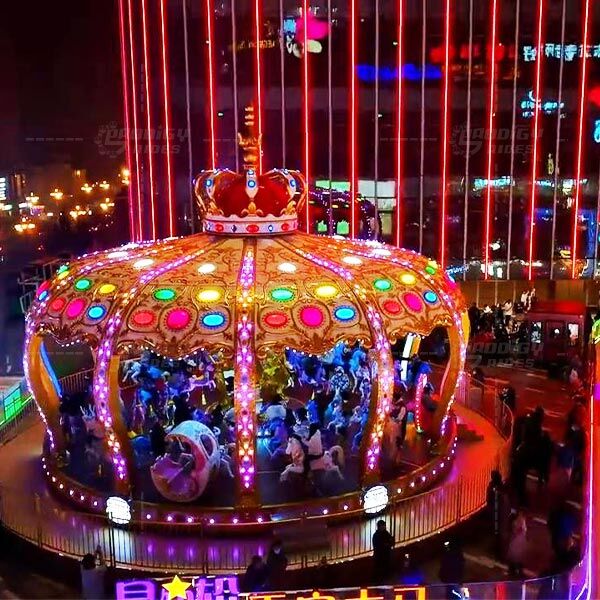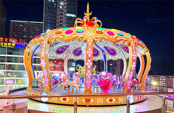 Карусель Luxury Royal Crown на 52 місця вирізняється серед класичних моделей завдяки унікальному дизайну у формі корони. Основним кольоровим акцентом є золота гама, доповнена розкішним декоративним підсвічуванням, що створює справжню казкову та мрійливу атмосферу.